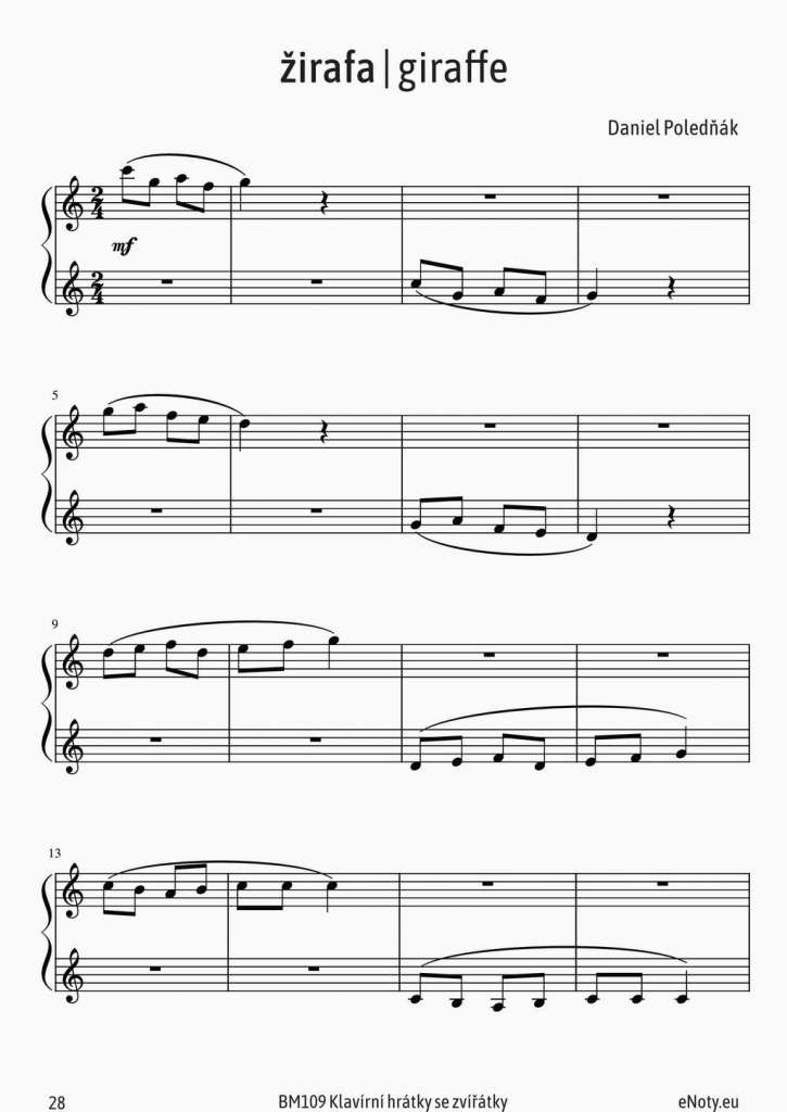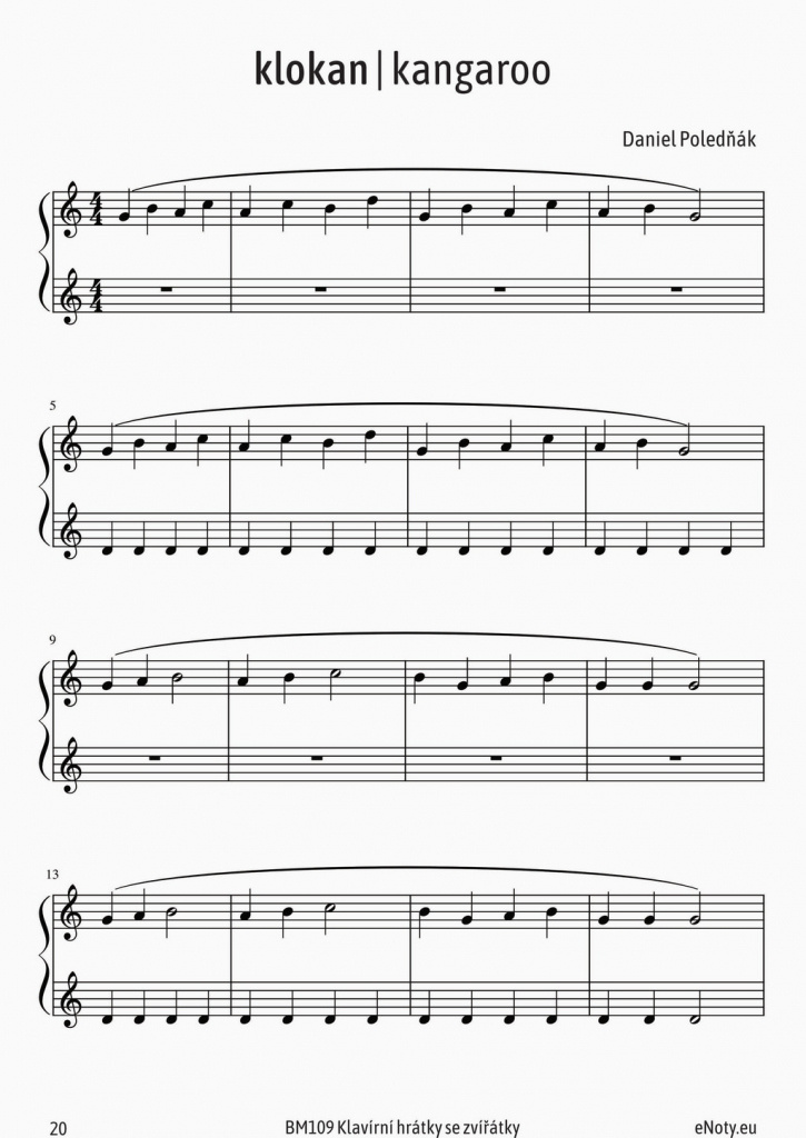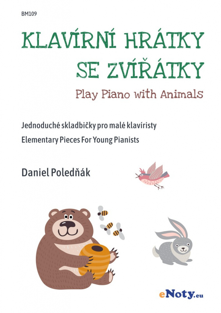 Titul Klavírní hrátky se zvířátky Vám prináša 15 zábavných a úplne jednoduchých skladbičiek na tému zvieratka. Malí klaviristi si tak môžu zahrať prespevovanie vtáčika, skákanie zajaca alebo blaznivý opičí tanček. Všetky skladbičky sú na dve stránky a obe ruky hrajú v husľovom kľúči. Skladby v zošite sú zoradené podľa veľkosti zvieratka, od najmenšieho (beruška) po najväčšie (slon).