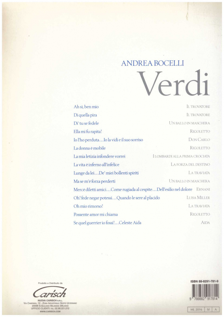 Výber árií z Verdiho opier, upravených pre klavír a sólový hlas. Vybral Andrea Bocelli, vrátane árií z opier ako La Traviata, Rigoletto a Aida.