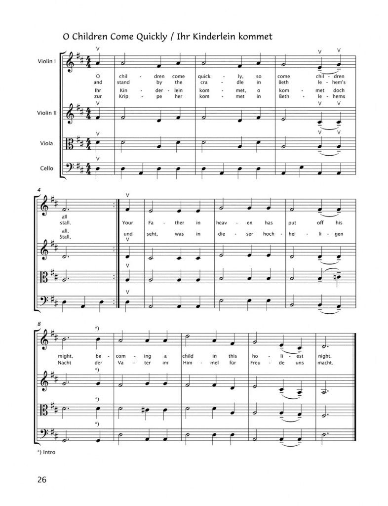 Vianoce sú časom na tvorbu hudby, najmä v súboroch. Toto vydanie s veľmi jednoduchými aranžmánmi pre dvoje husle, violu a violončelo je ideálne pre začínajúcich sláčikových hráčov, ktorí sa chcú naladiť na vianočnú atmosféru. 27 skladieb je založených buď na dielach barokových skladateľov, ako sú Lully alebo Händel, alebo na tradičných, prevažne nemeckých vianočných koledách. Jedna zo skladieb vyžaduje ďalšie husle, ďalšia violu.