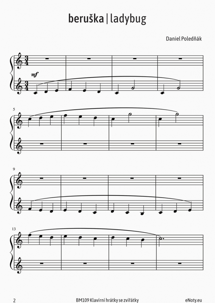 Titul Klavírní hrátky se zvířátky Vám prináša 15 zábavných a úplne jednoduchých skladbičiek na tému zvieratka. Malí klaviristi si tak môžu zahrať prespevovanie vtáčika, skákanie zajaca alebo blaznivý opičí tanček. Všetky skladbičky sú na dve stránky a obe ruky hrajú v husľovom kľúči. Skladby v zošite sú zoradené podľa veľkosti zvieratka, od najmenšieho (beruška) po najväčšie (slon).