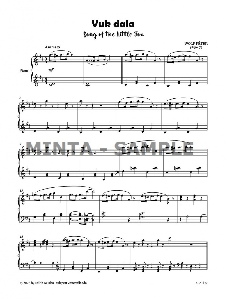 Péter Wolf (*1947) je skladateľ s pestrou paletou znalostí, ktorý sa cíti rovnako doma v mnohých žánroch, od koncertnej hudby až po tanečnú hudbu, a je široko uznávaný za svoje nezabudnuteľné príspevky. Jeho hudbu k animovanému filmu Vuk od Attilu Dargaya z roku 1981 pozná a miluje každá generácia od jeho premiéry. Roztomilú pieseň líščieho šteniatka predstavujeme v transkripciách, ktoré skladateľ pripravil pre potešenie mladých hudobníkov.